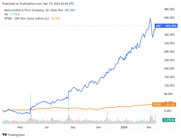 The Street has caught onto the bullish story with Abercrombie & Fitch. The shares are up 402% over the last year, easily beating the S&P 500 up 30.3% during that same time.
