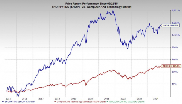 Shopify stock crushed Amazon during both periods, yet it trades 50% below its all-time highs.