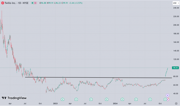 The share price surged past the $80 resistance level and has since climbed nearly $20 higher. This momentum suggests there may still be significant upside potential, supported by Twilio’s appealing valuation and promising growth forecasts.