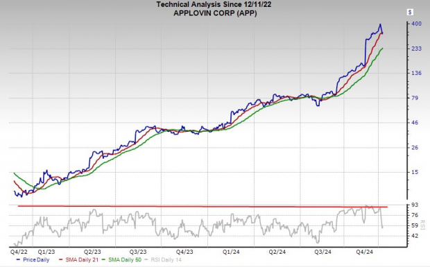 AppLovin’s valuation might force a recalibration of its stock price in the short run. But APP stock jumped off its 21-day moving average on Wednesday after cooling off from overheated levels.