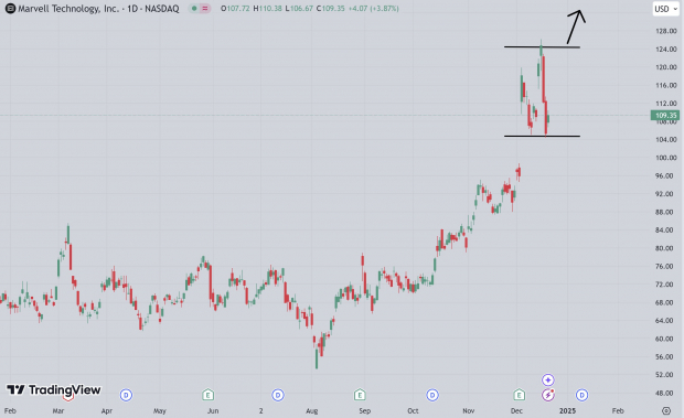 Because of this development, analysts have been quick to raise their earnings estimates for the company, and Marvell Technology now has a Zacks Rank #1 (Strong Buy) rating. Not surprisingly, MRVL stock broke out aggressively following the recent quarterly report. Now after gapping higher, the stock price has been forming a bullish consolidation. If the AI boom is to continue, I would expect MRVL stock to continue to consolidate over the next few weeks, and again break higher.
