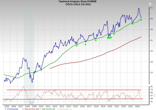 Thankfully, Coca-Cola has been diversifying beyond sugary sodas for a long time to match changing consumer habits. KO stock is trading right at its 50-month moving average, where it has found support every time it tests that level since the financial crisis.
