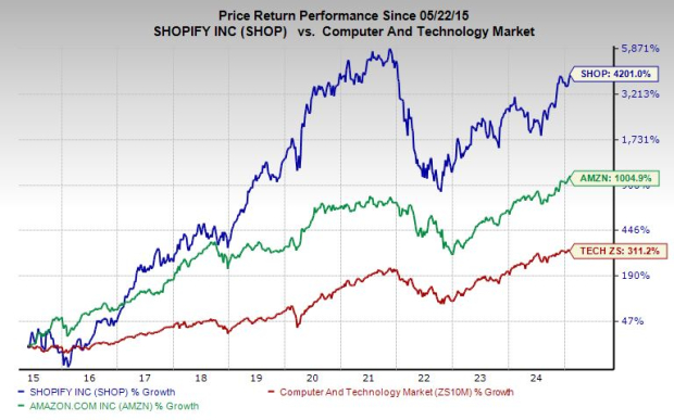 SHOP’s run includes a 160% climb in the past five years, with its recent surge helping it outpace Tech during this stretch despite trading 27% below its highs.
