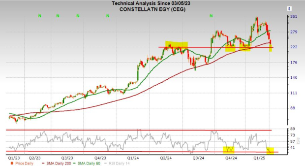 CEG’s 35% drop from its January peak pushed it below its 200-day moving average and to its most oversold RSI levels since its last rebound.