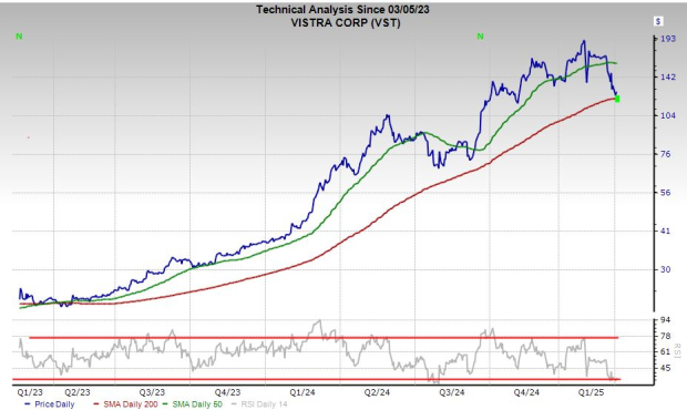 VST has tumbled around 35% from its January highs and trades 50% below its average Zacks price target. Vistra is finding some support at its 200-day moving average.