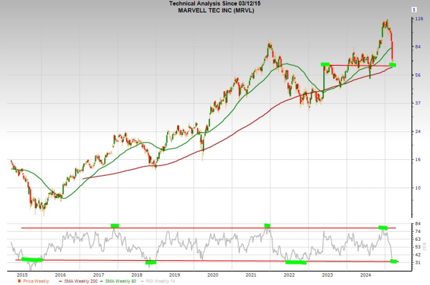 MRVL fell from its most overbought RSI levels in the past decade to some of its most oversold. Marvel is attempting to find support near its long-term 200-week moving and its May 2023 breakout levels.