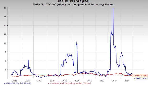 Marvel’s selloff, mixed with its earnings growth picture has it trading at a 50% discount to the Zacks Tech sector and 95% below its highs at a Price/Earnings-to-Growth ratio of 0.75. MRVL is trading at its decade-long lows in terms of its PEG ratio even though the stock has climbed 335%.