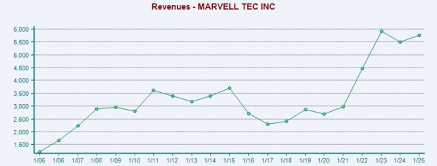 Marvel stock has climbed 335% in the past decade to outpace the Zacks Tech Sector’s 275%. More recently, MRVL crushed tech, up 235% during the last five years vs. its sector’s 133%.