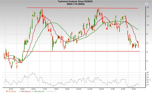 It was recently rejected at its 21-day moving average and might find support near the low end of its year-long trading range. IREN trades at a 67% discount to its industry and 75% below the Tech sector, at 6.4X forward earnings.