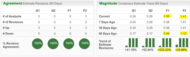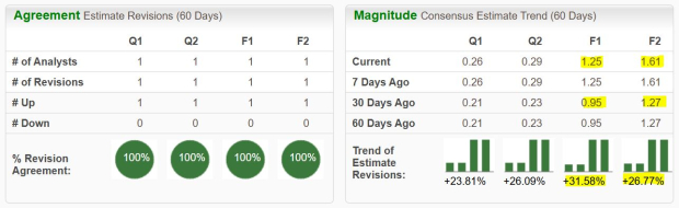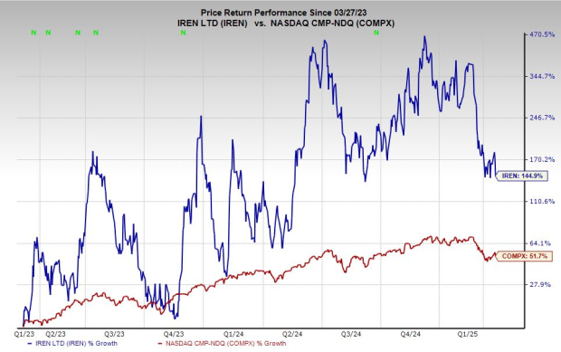 IREN posted 150% revenue growth in FY24, with Q2 FY25 sales up 125%, fueled by a 129% surge in Bitcoin mining. The firm’s huge beat-and-raise quarter lifted its FY25 consensus EPS estimate by 533% (from $0.06 to $0.38), with its FY26 estimate 26% higher. IREN’s upbeat outlook earns it a Zacks Rank #2 (Buy).
