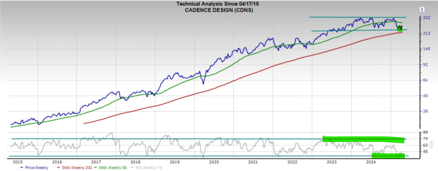 Cadence trades roughly 20% below its highs and has been stuck in a trading range for over a year. The stock found support near its 200-week moving average and a critical May 2023 breakout level.