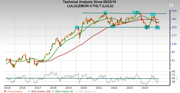 LULU trades 38% below its peaks, and it is down 17% in 2025 vs. its sector’s 3% YTD pop. The recent struggles are part of a five-year chop following a stellar rally between 2014 and 2021.