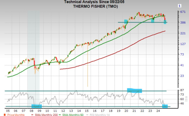 The life sciences supplier stock has skyrocketed by over 1,400% in the past 20 years to triple the S&P 500. The outperformance includes its 40% dive from its late 2021 peaks. TMO stock is attempting to hold its ground at its summer 2020 breakout levels while trading at its most oversold RSI levels since 2008/09.