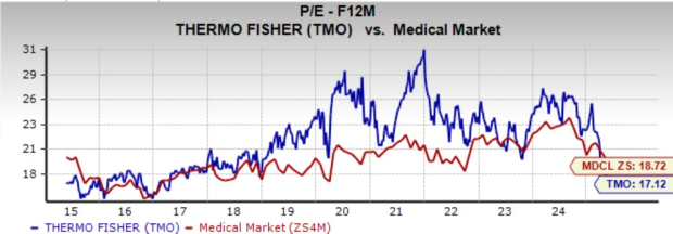 The selloff has Thermo Fisher trading at some of its lowest valuation levels in the past decade and at a discount to its sector at 17.1X forward earnings (despite climbing 200% in the past 10 years vs. its sector’s -8% decline).