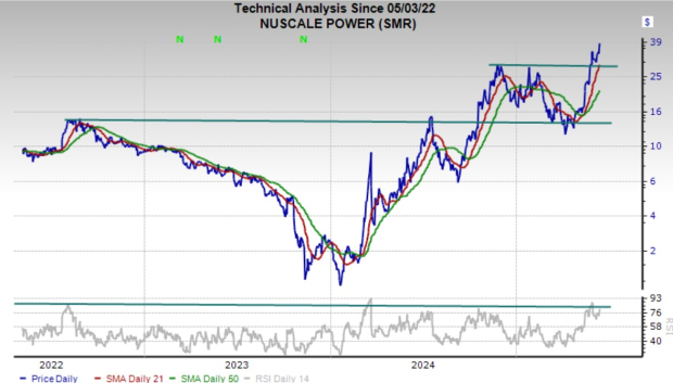 No stock can go straight up forever, and SMR is trading solidly above its 21-day moving average, at overheated RSI levels, and well above its average Zacks price target. NuScale also trades at 99X forward sales. That said, the momentum might continue in the short run if FOMO buying heats up.