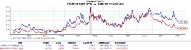 As renowned holding companies, both provide a wide range of financial products and banking services for institutional investors, including high-net-worth clients. Furthermore, State Street and New York Mellon are expected to post double-digit EPS growth in fiscal 2025 and FY26, with their Q2 reports expected to reflect 10% and 15% earnings growth, respectively.