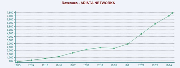 Since the pandemic, Arista Networks’ top line has expanded more than 200% with 2020 sales at $2.31 billion. The remarkable post-pandemic surge has been fueled by major cloud players like Microsoft (MSFT) and Alphabet (GOOGL), which rely heavily on Arista Networks’ tailor-made AI data center networking platforms.