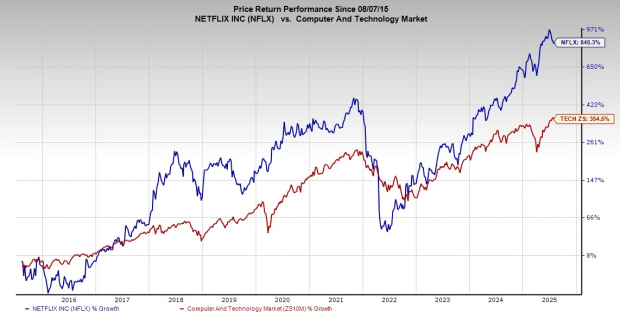 That selloff seems like a lifetime ago. Netflix successfully addressed all of Wall Street’s worst fears and then some, helping the stock blow away all of the Magnificent 7 stocks outside of Nvidia during the past three years. More recently, NFLX has charged 95% higher in the last year, tripling the Zacks Tech sector.