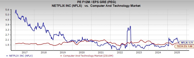 On the price-to-earnings-to-growth (PEG) ratio front, Netflix trades in line with Tech at 1.7 despite its massive outperformance and nearly 60% below its five-year highs. Disney’s PEG ratio sits at 1.6, yet DIS stock climbed just 14% in the past 10 years.