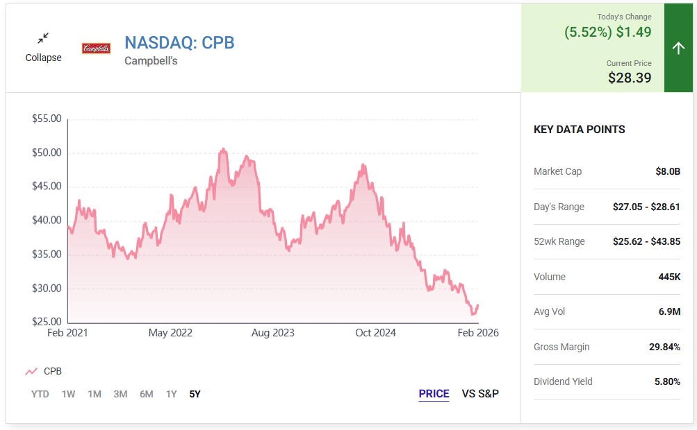 A second high-octane dividend stock that’s begging to be bought in February is food and beverages behemoth, The Campbell’s Company (CPB). With shares recently hitting their lowest mark since May 2009, Campbell’s dividend yield has surged to an all-time high.